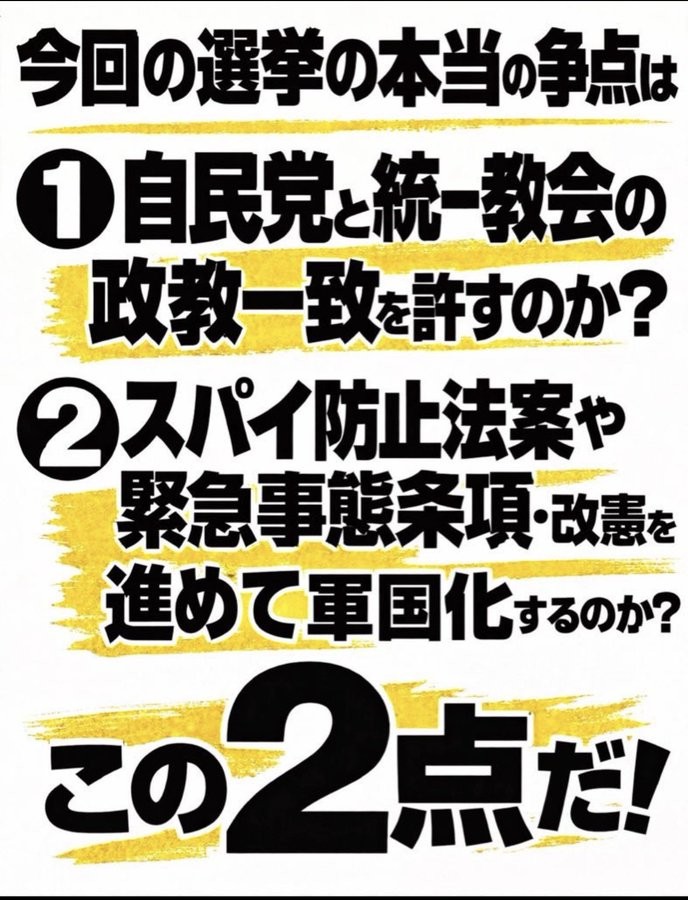 国民を戦争に巻き込むな!統一高市が選挙後やろうとしていること