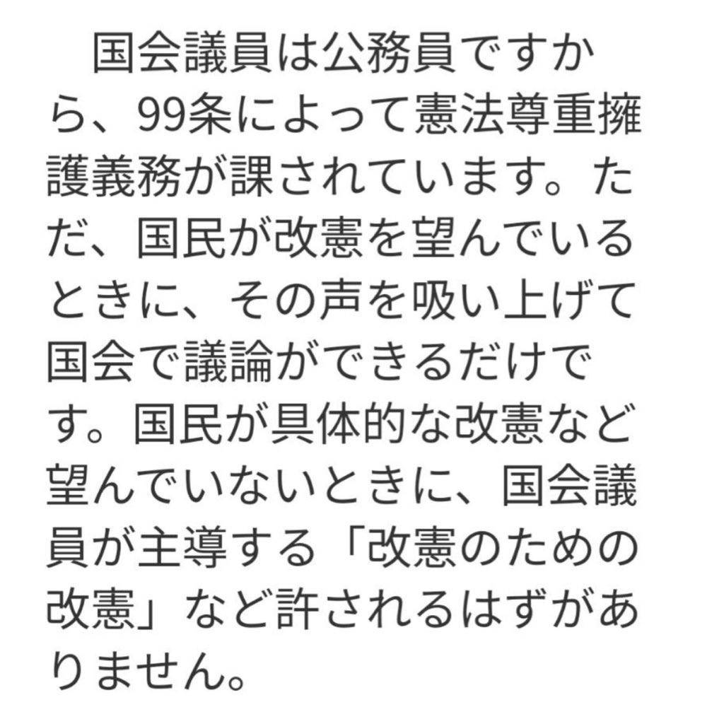【現在行われている憲法審議はおかしい。法律をまず決め、国民へ公開し、国民投票をしてから、憲法審議をするのが筋です。日本は民主主義国家なのだから】